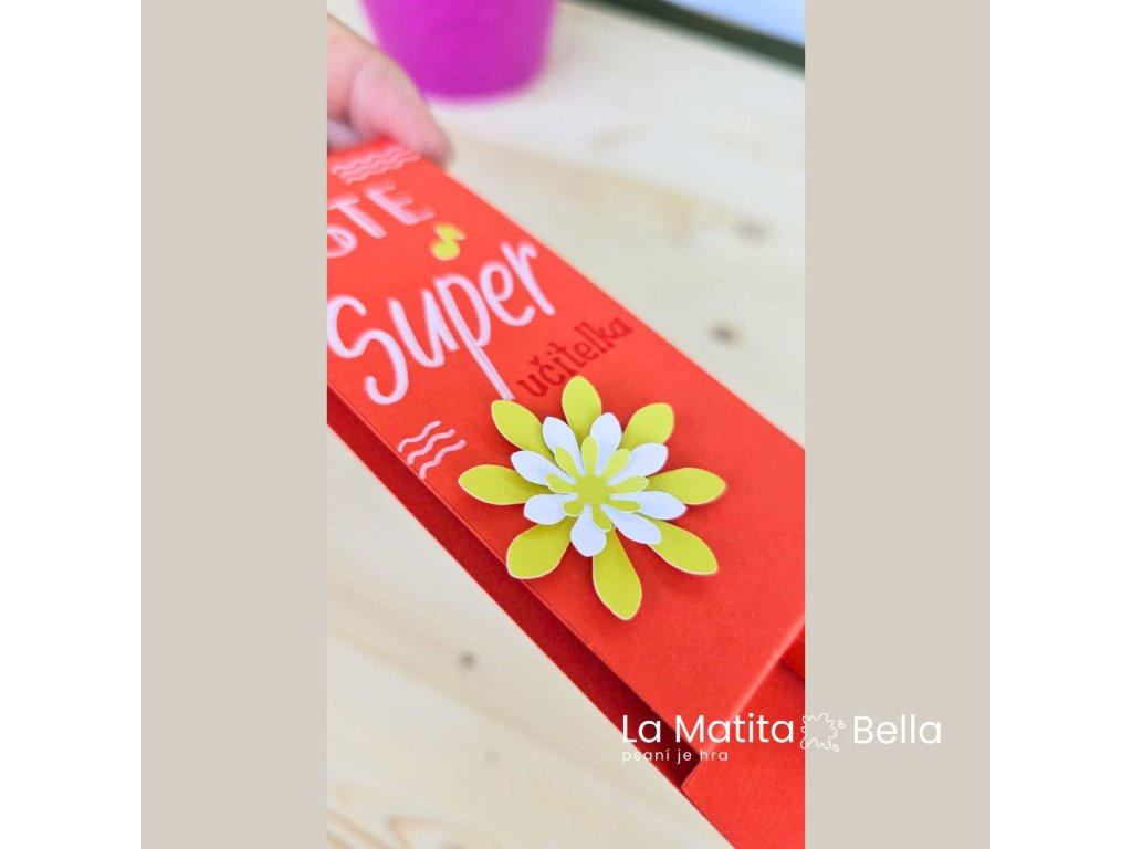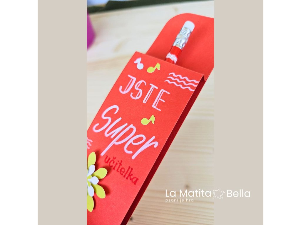 Tenhle dárek je malý, milý, osobní a hlavně – hotový. Ručně vyrobené papírové pouzdro s vlastnoručně psaným vzkazem, který jsem vymyslela přímo pro učitele, a uvnitř obyčejná grafitová tužka s vytištěnou násobilkou (praktické body navíc!).