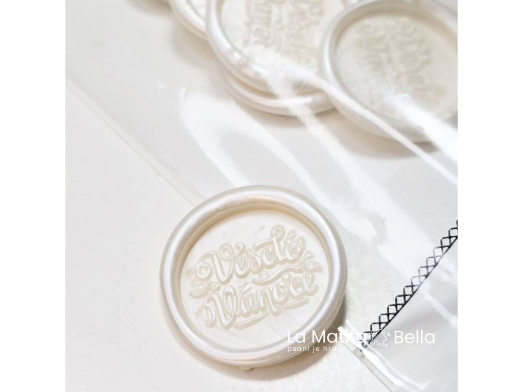 Každá pečeť je odlita ručně ze smetanově perleťového vosku, který se na světle jemně leskne a dodává každému přání, dopisu nebo dárku špetku svátečního luxusu.